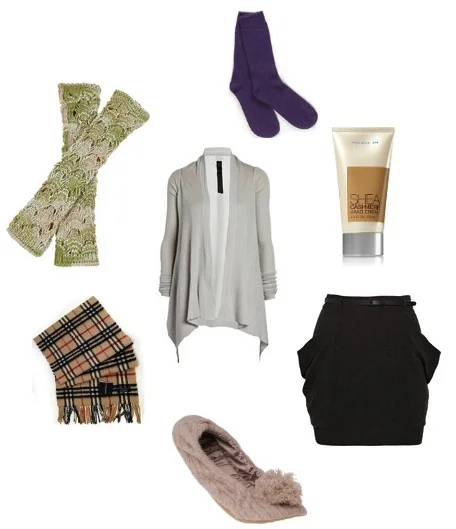 Missoni arm warmers, Rick Owens cardigan, Bath & Body Works lotion, Theory skirt, Burberry scarf, J.Jill slippers