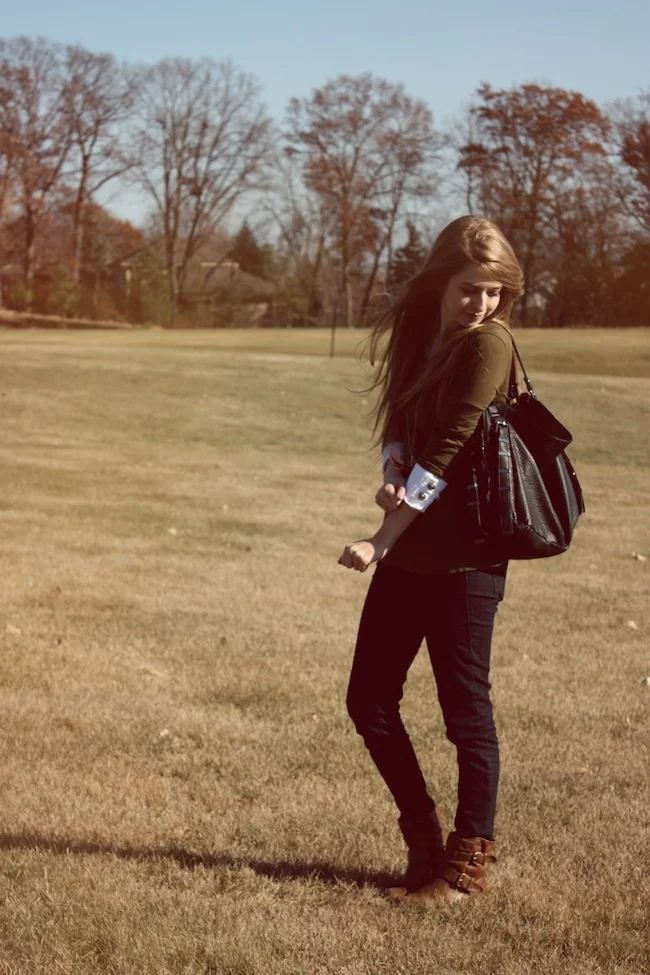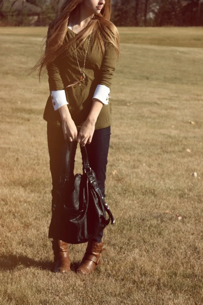 Free People thermal, olive green tee c/o Three Dots, SOLD design lab jeans, Wanted ankle boots, F21 necklace, bag c/o SAS handbags, Essie's Bangle Jangle nail color