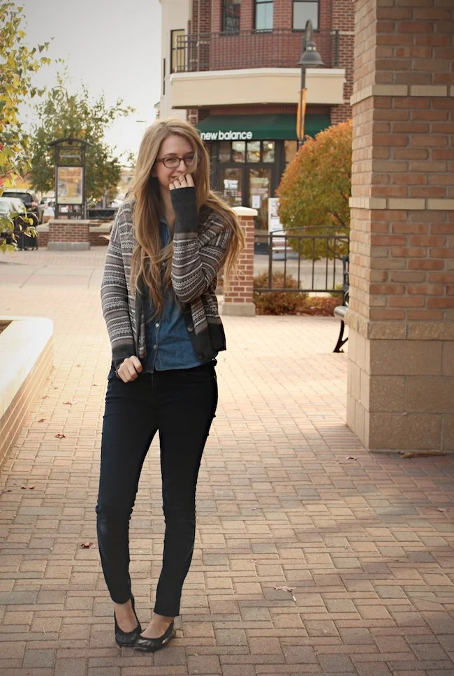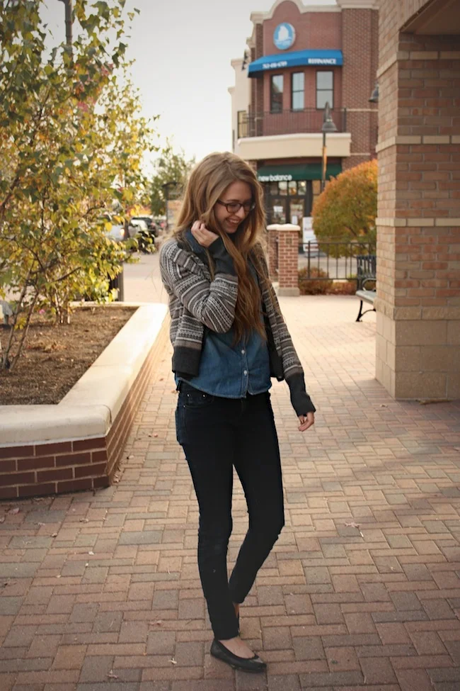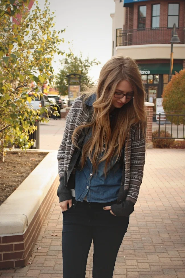 H&M chambray shirt, fair isle cardigan c/o Kensie, BDG jeans, Yosi Samra flats