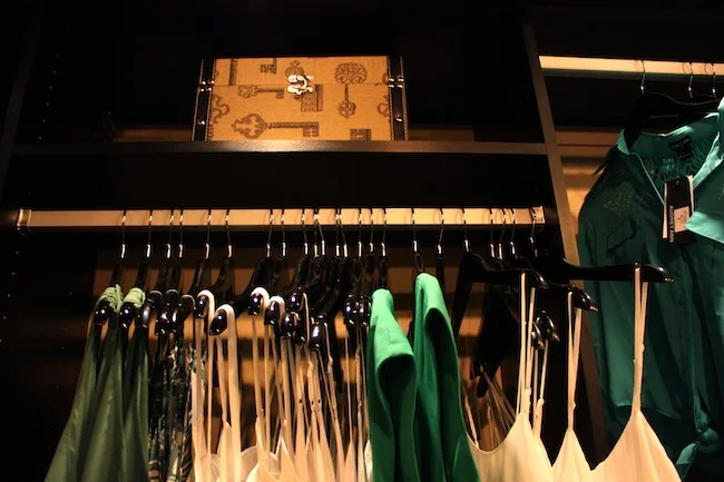 Green. I fell in love with the different shades of emerald and teal arranged underneath this lovely display trunk. So many pretty colors!