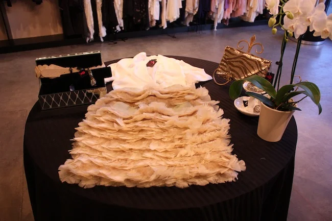 I was so inspired by this front table layout; the feather skirt is an excellent statement piece, especially styled with a great silky white blouse.