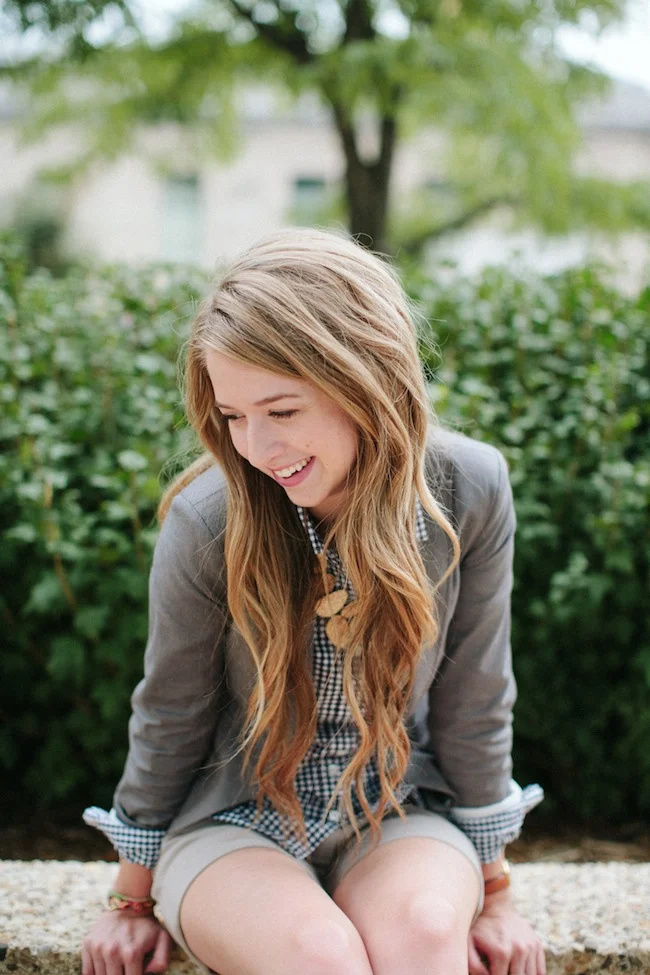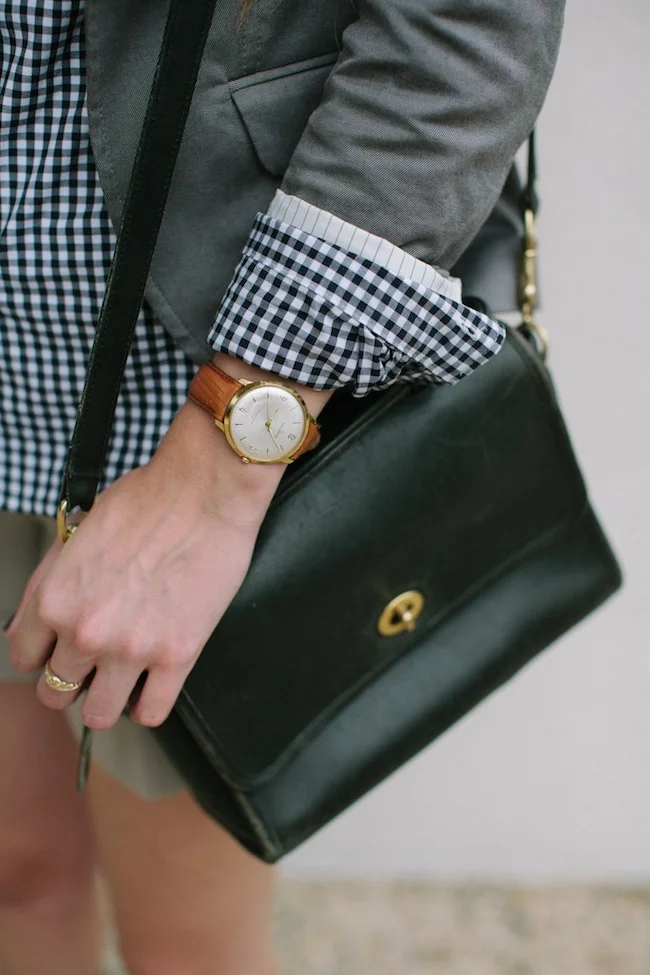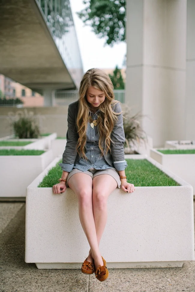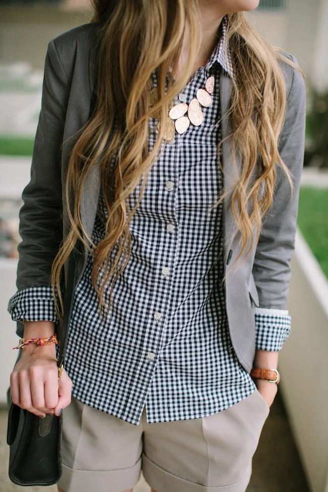 This outfit was inspired by a menswear look at Macy's Glamorama 2012. I can't believe I didn't come up with wearing gingham under a blazer on my own...and I'm so excited to layer up this look with long pants and a scarf for fall. It's arriving quickly, and I can't wait.