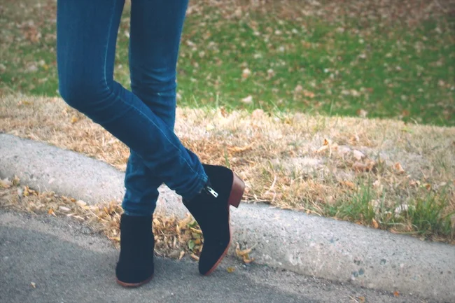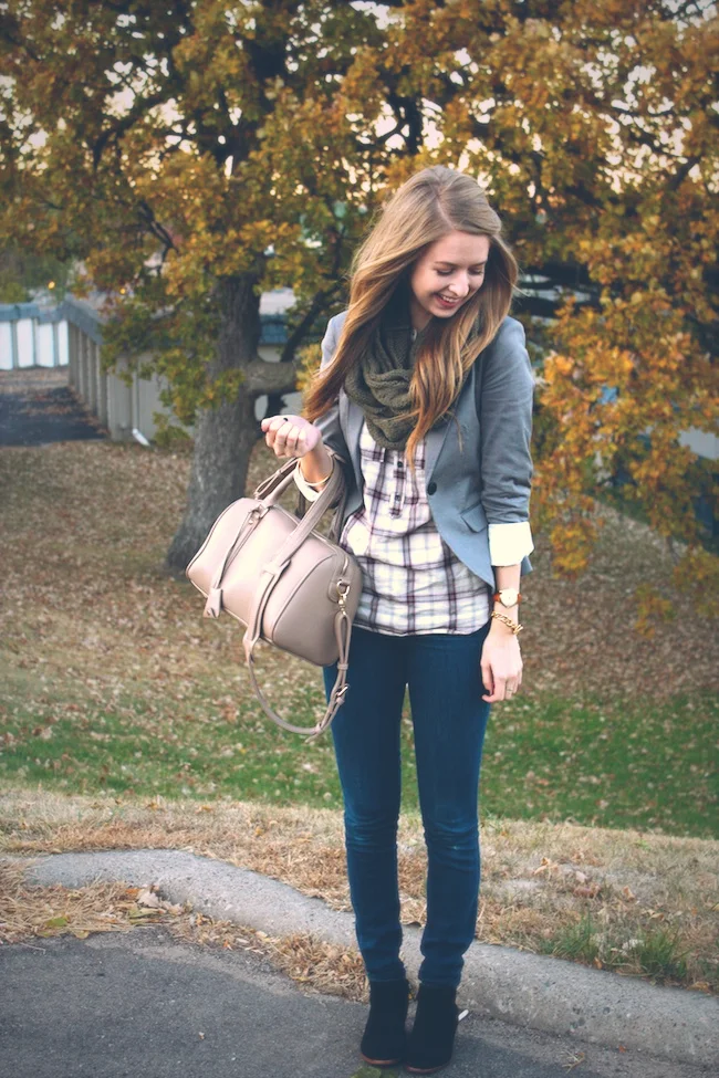 I've had fun styling my new ankle boots (a pair that has been on my wishlist for months now) for both work and play. Between the burgundy plaid top and mossy green scarf, this look incorporates some of my favorite pieces for autumn, while the blazer keeps it office-appropriate. But these boots are equally cool for downtown adventures that have nothing to do with work! Friday's post will be showing a great way to style them for a more casual scenario. Hope you all have an excellent Monday!