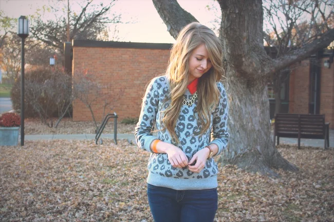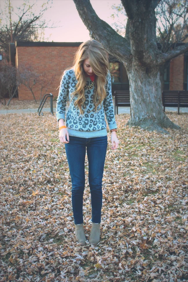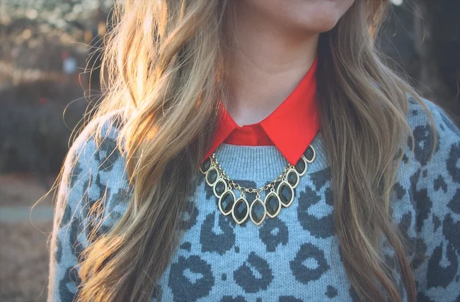 This was what I wore on Halloween, telling anyone who asked that I was a "leopard, obviously." I've never been a huge fan of Halloween, so this is as close to a costume as I'll get. This necklace from Outfit Additions added the perfect touch of glam to an otherwise casual look! I usually feel pretty boyish pairing a button-up underneath a sweater, but between the leopard print and glitzy necklace, I ended up feeling quite girly indeed.
