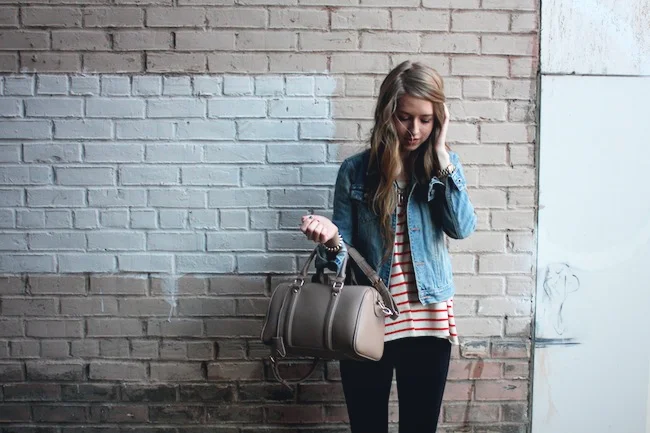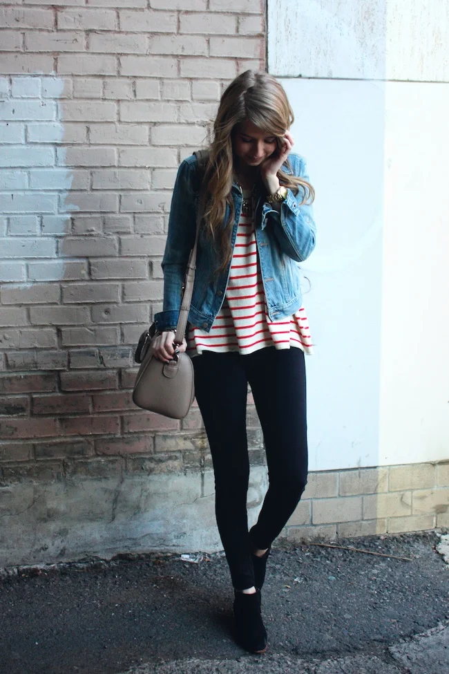 Abercrombie denim jacket, BDG sweater, J.Crew Pixie pants, Sam Edelman Petty boots, bag from Francesca's
