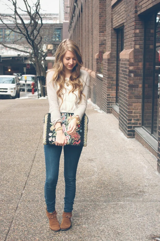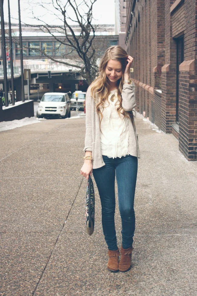 Ann Taylor top, Forever 21 cardigan, Madewell jeans, ankle boots c/o Minnetonka Moccasin, Mellow World laptop sleeve (exact style not available, similar here!)