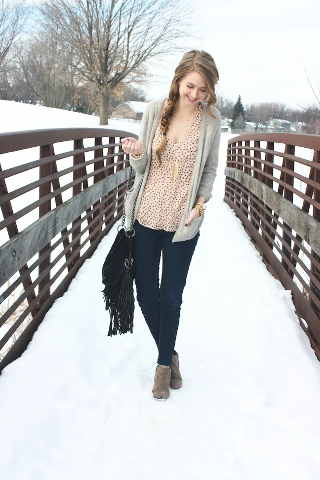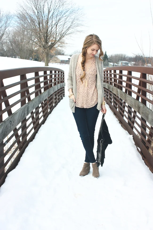 F21 cardigan, blouse c/o The Elle Boutique, Levis 535 denim leggings, Sam Edelman Petty ankle boots, Cut 'n' Paste Lia bag