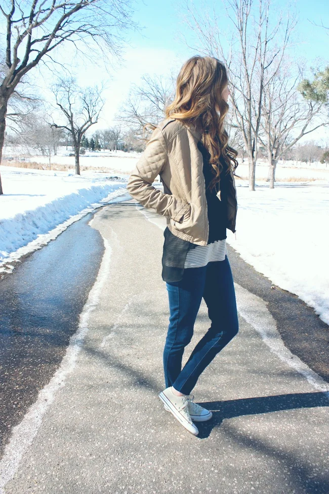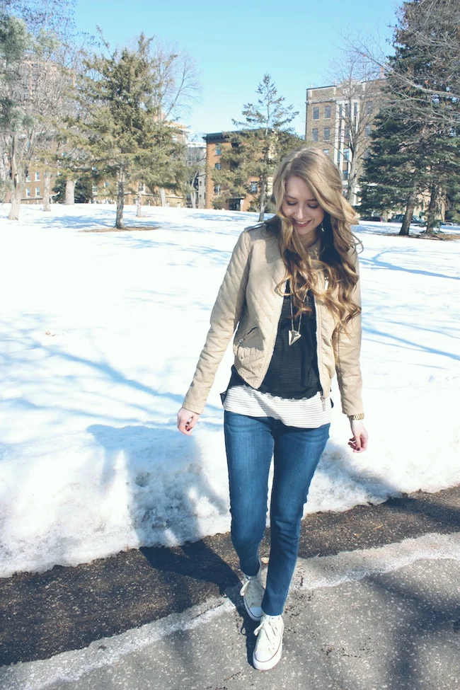 Forever 21 jacket and necklace, tank c/o The Elle Boutique, Levis 535 legging jeans, Converse sneakers