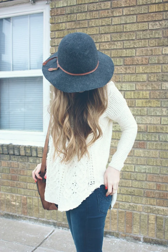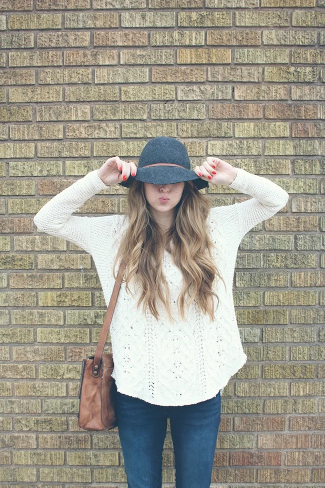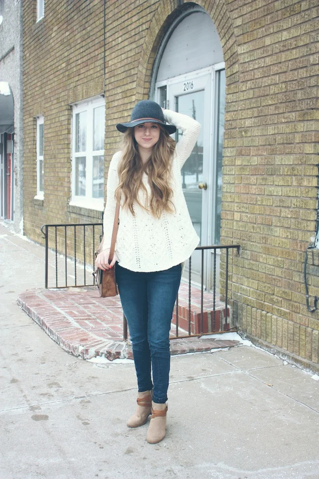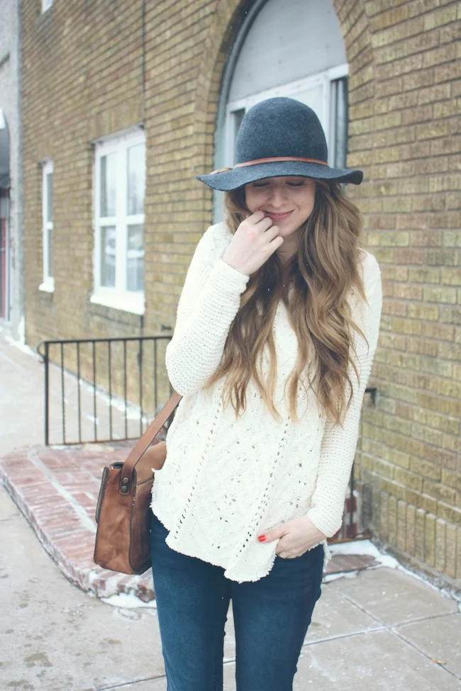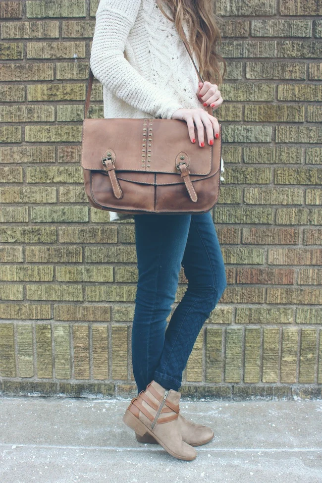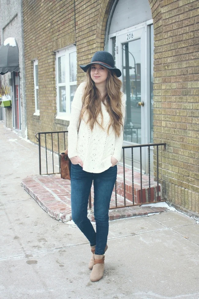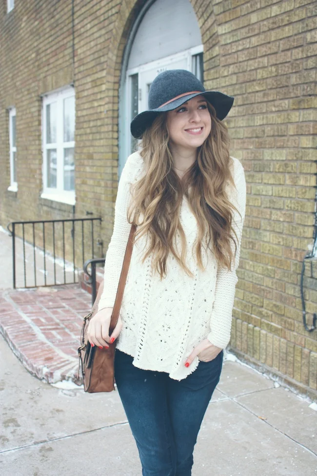 Free People sweater and hat, JustFab denim and boots, Patricia Nash handbag
