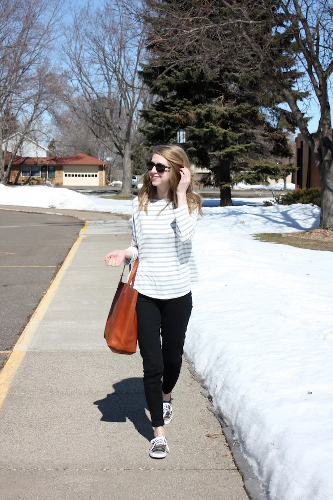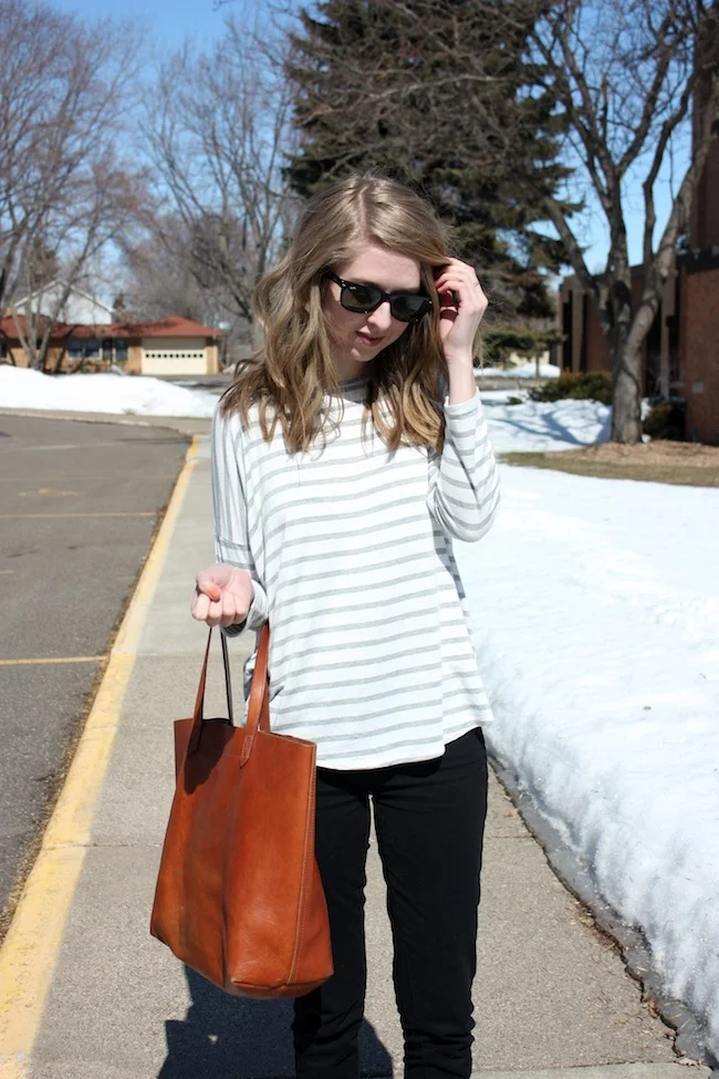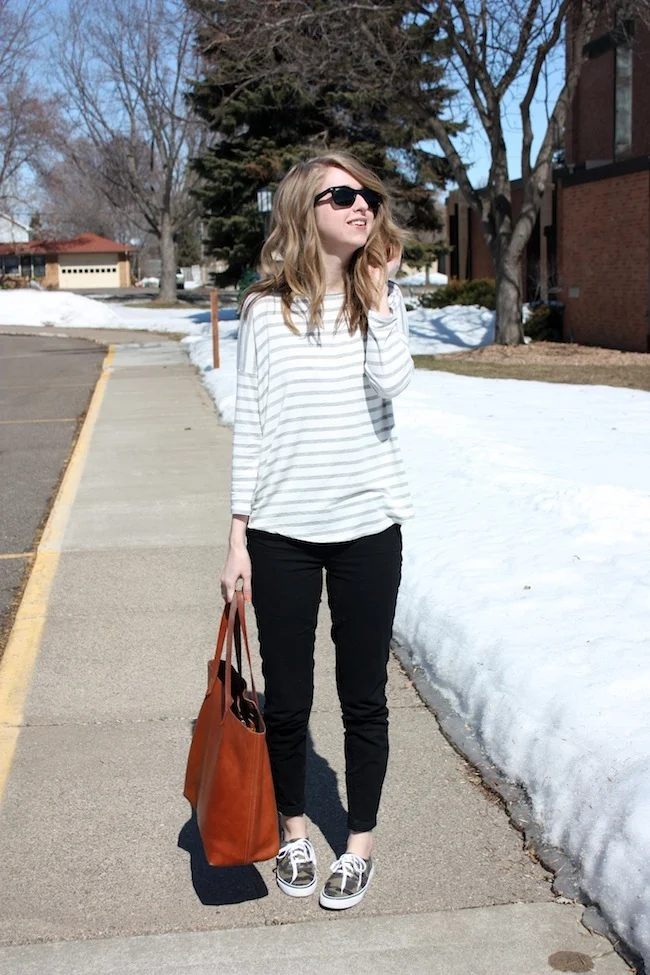 Forever 21 tee, JustFab denim, Madewell tote, H&M sneakers