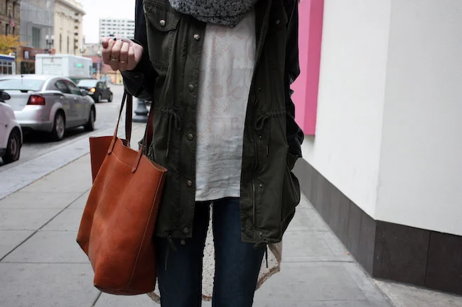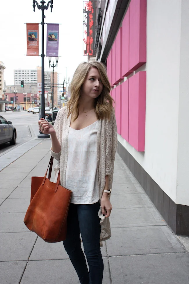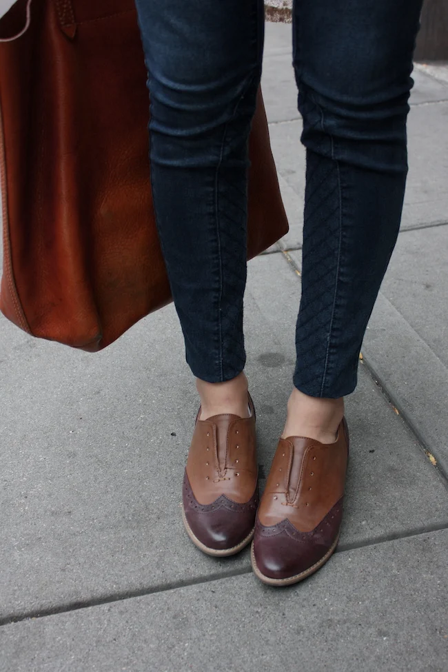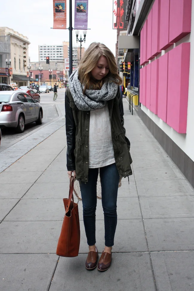 Bella Luxx tank, AX Paris cardigan, Aritzia jacket, JustFab denim, BC Footwear oxfords, Madewell bag, Lulu*s watch, SIX scarf