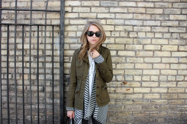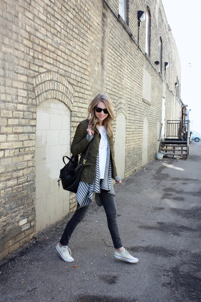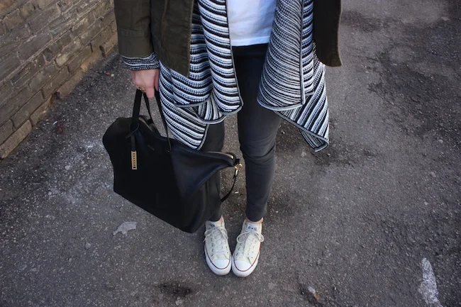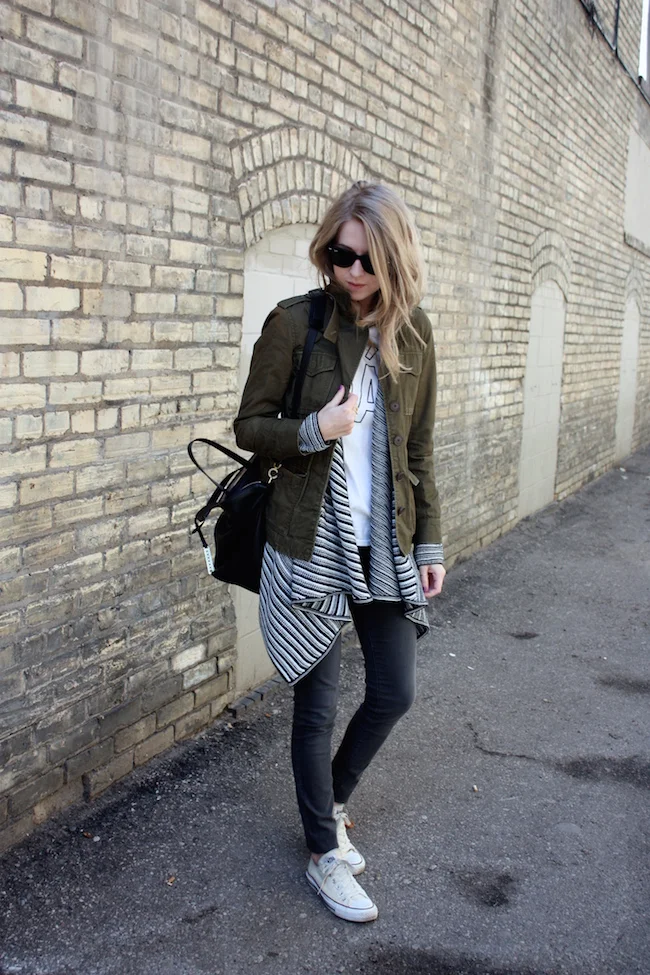 Sincerely Jules tee, Flying Monkey denim, Converse sneakers, BB Dakota cardigan (on sale!), Madewell jacket, Kate Spade Saturday handbag, Ray-Ban sunglasses