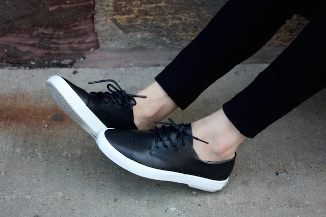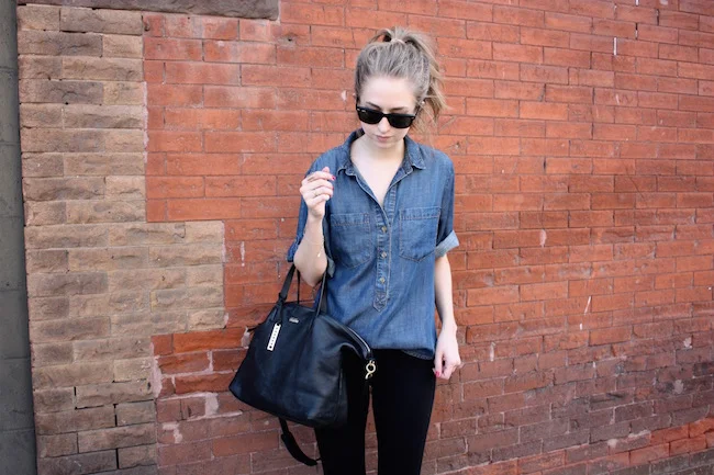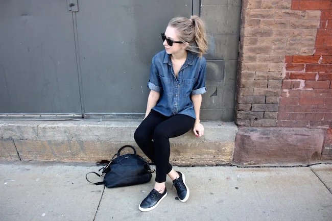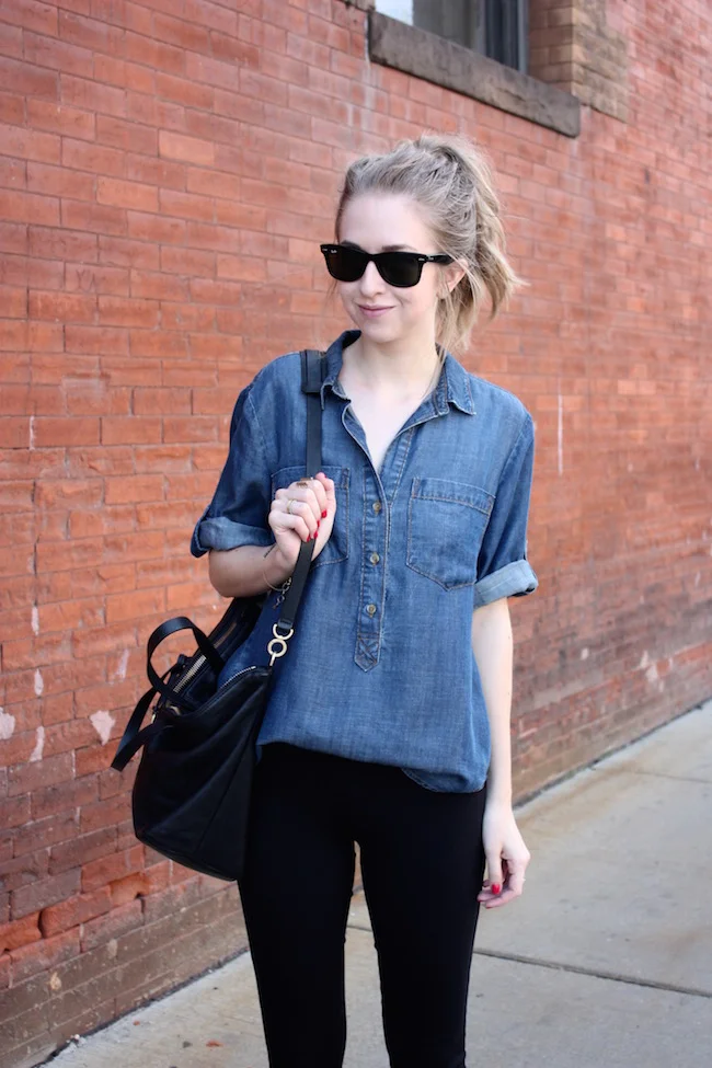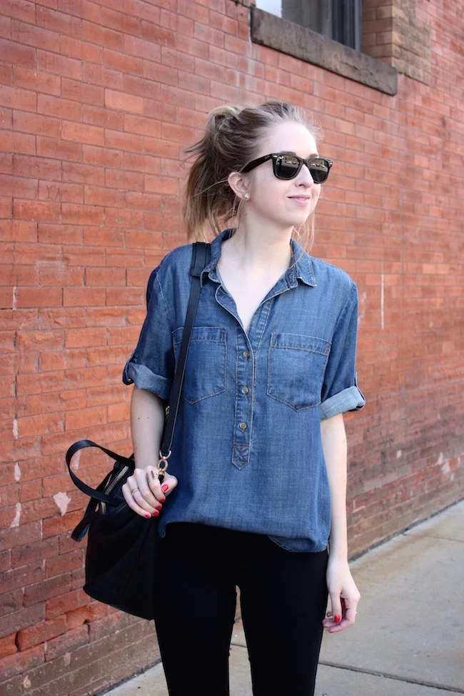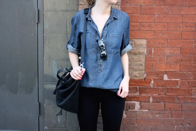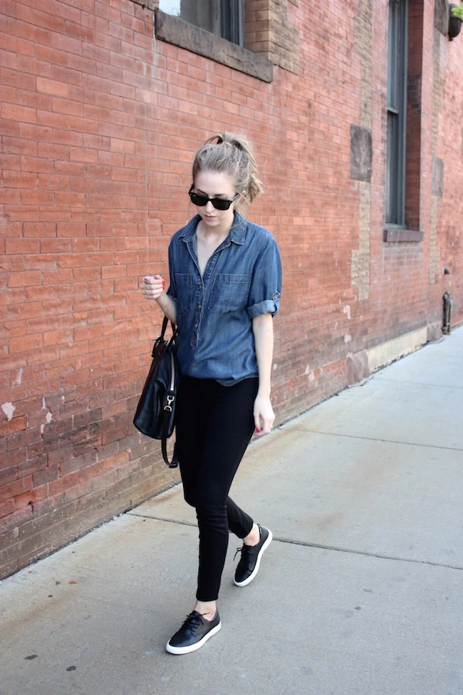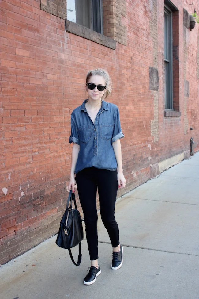 Bella Dahl denim shirt | J.Crew Pixie pants | Unnown Footwear sneakers | Kate Spade Saturday handbag | Ray-Ban sunglasses